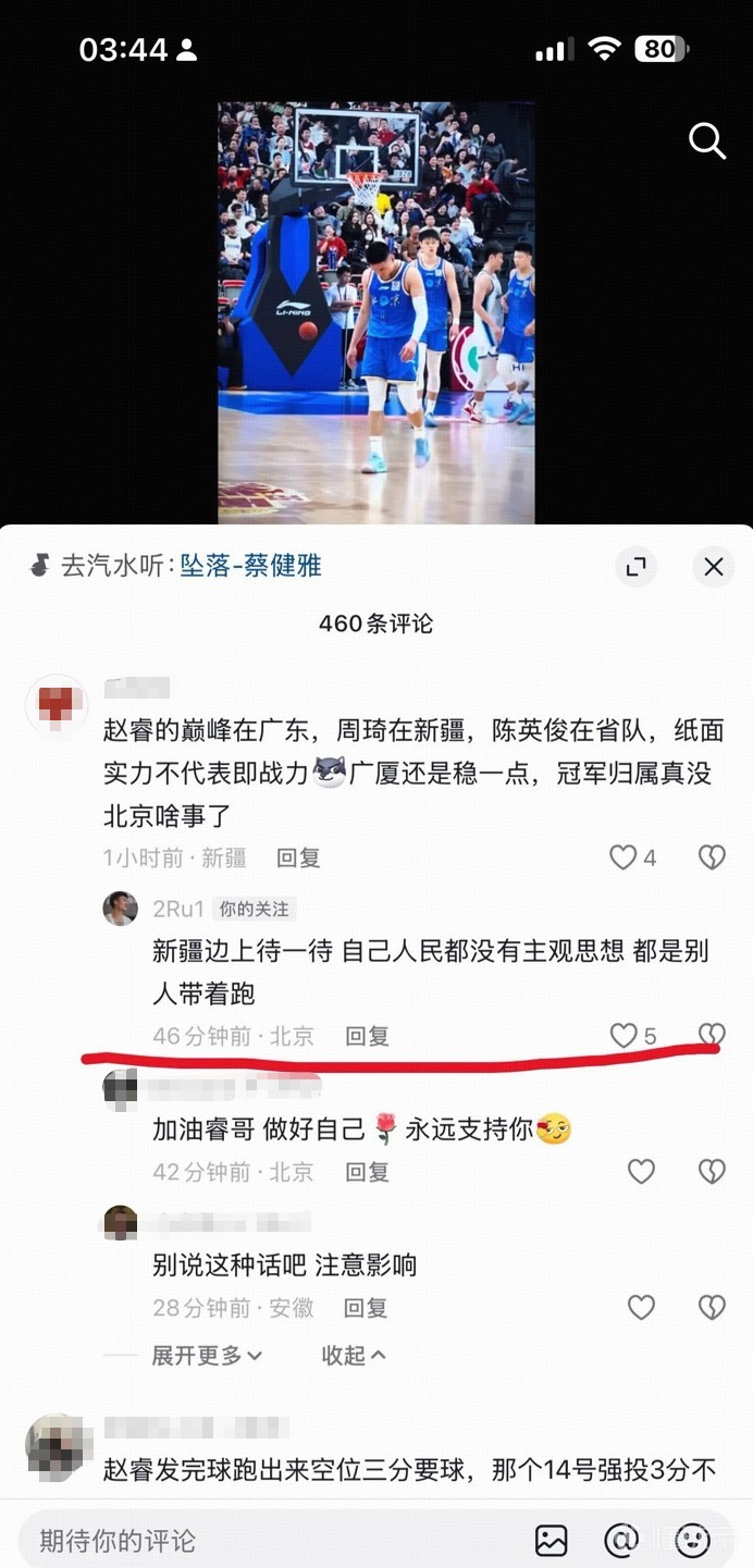 赛后,在社交媒体上出现了批评北京和赵睿的内容,据网传图片显示,北京后卫赵睿现身评论区,回复了两名IP属地新疆的球迷。