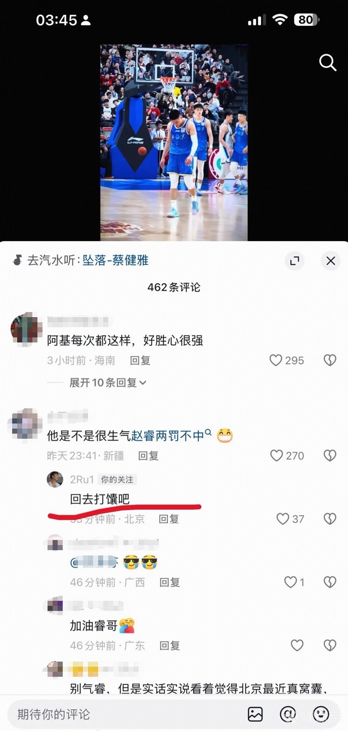 第一位球迷将输球矛头指向赵睿:他是不是很生气赵睿两罚不中。赵睿回复道:回去打馕吧。
